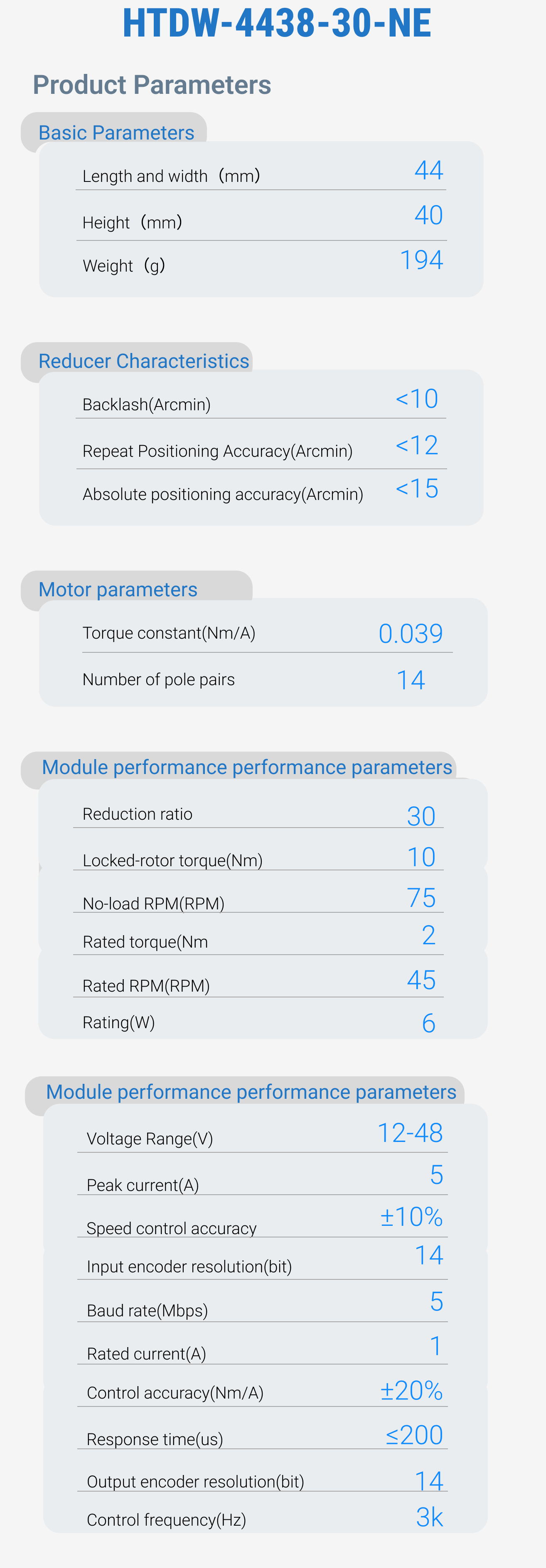 The HTDW series sets a new benchmark in precision motion with its high-efficiency planetary gearmotors, expertly optimized for both power transmission and backdrivability. Powered by our proprietary low-cogging brushless DC motors, it ensures ultra-smooth and stable performance with minimal torque ripple. Dual absolute encoders provide reliable positioning, while advanced current loop control enables highly responsive and accurate force output — making it the ideal choice for high-performance robotics and automation applications.